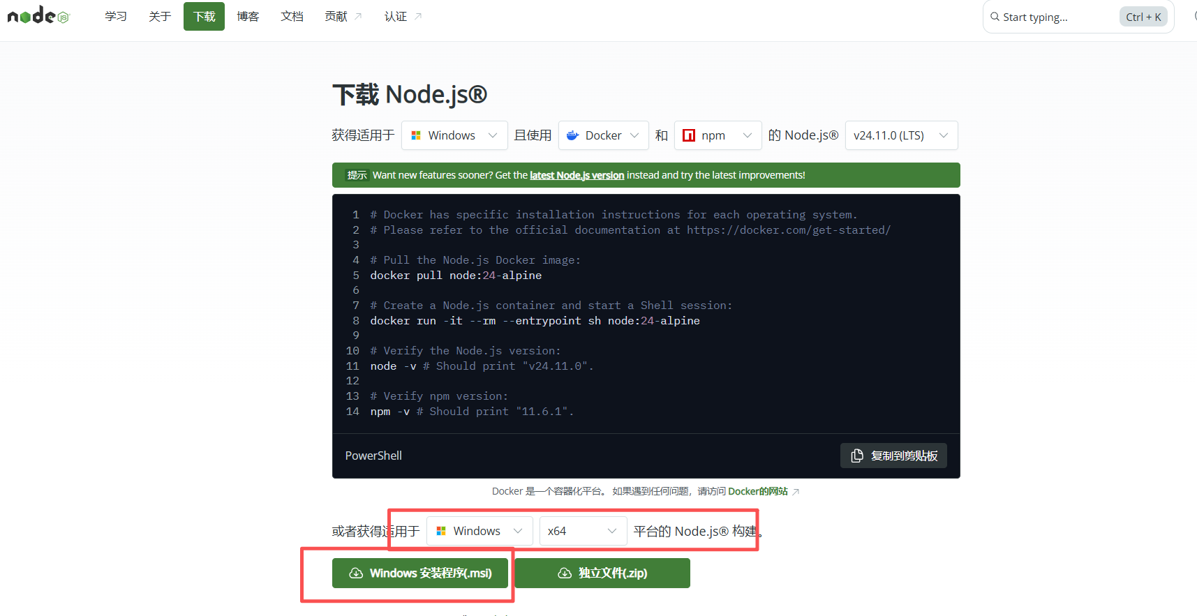 访问node.js官网,下载的时候选择windows安装程序进行下载。