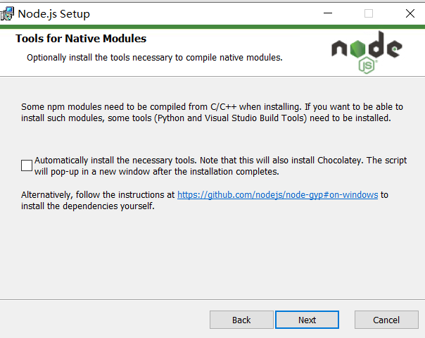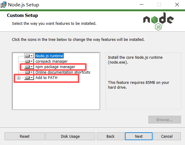 选择需要安装的功能模块,需要确保NPM包管理器和添加环境变量被选中,一般默认自动选中: