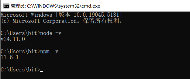 安装完成后打开dos窗口,输入node -v和npm -v命令,检查node.js环境和npm包管理器是否安装成功: