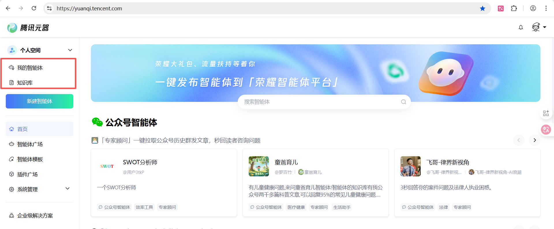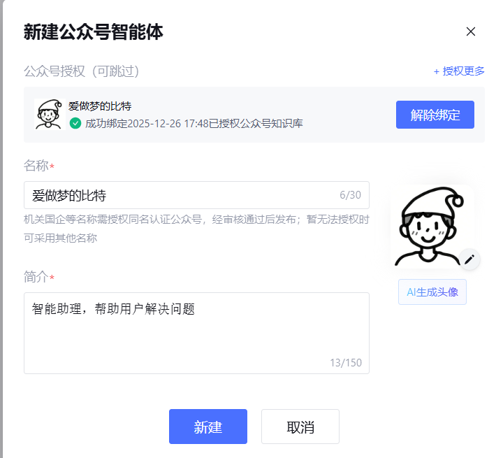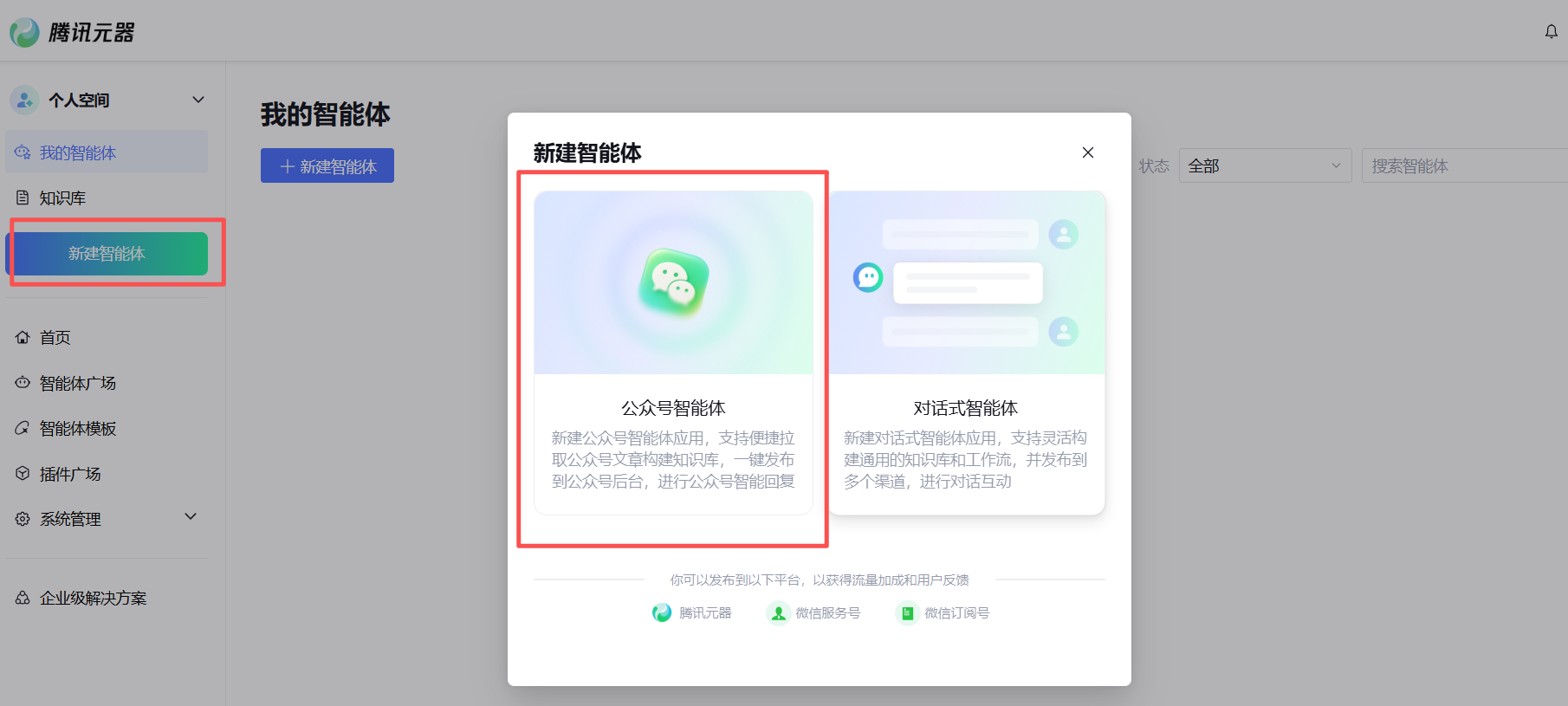 接下来就可以创建智能体了,点击左侧【新建智能体】按钮,选择【公众号智能体】: