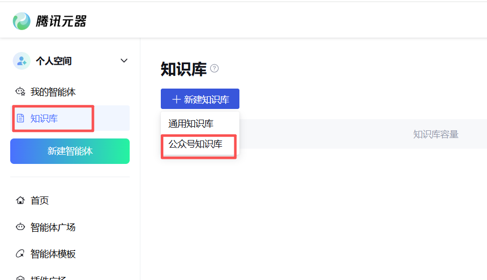 登录后我们首先需要建立一个公众号知识库,点击左侧【知识库】选项,点击【新建知识库】-【公众号知识库】: