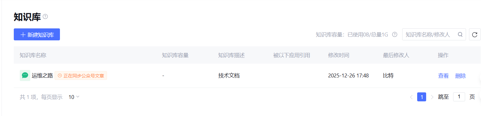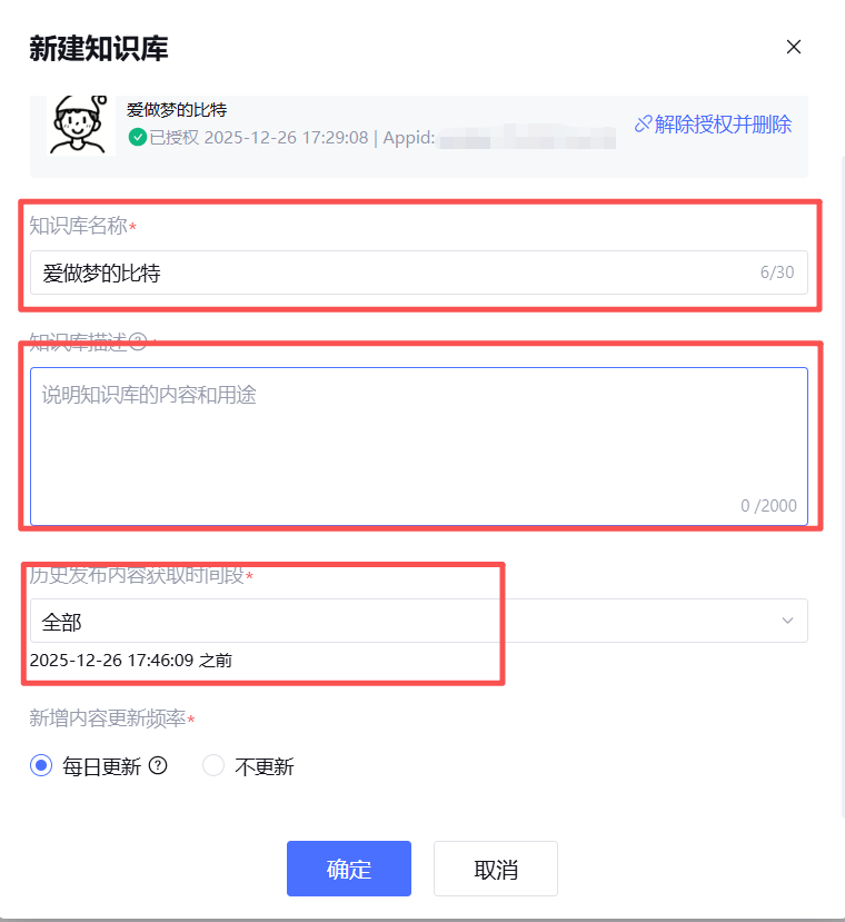 授权完成后,填写知识库名称与描述,点击确定就创建完成了: