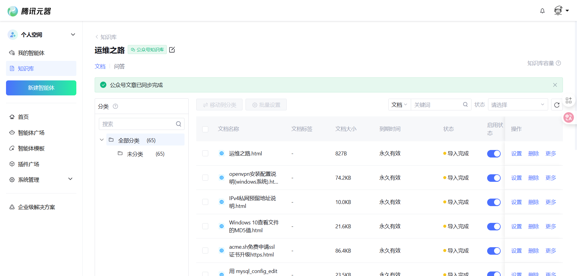 知识库创建完成后腾讯元器会自动同步公众号文章,然后进行切片分解: