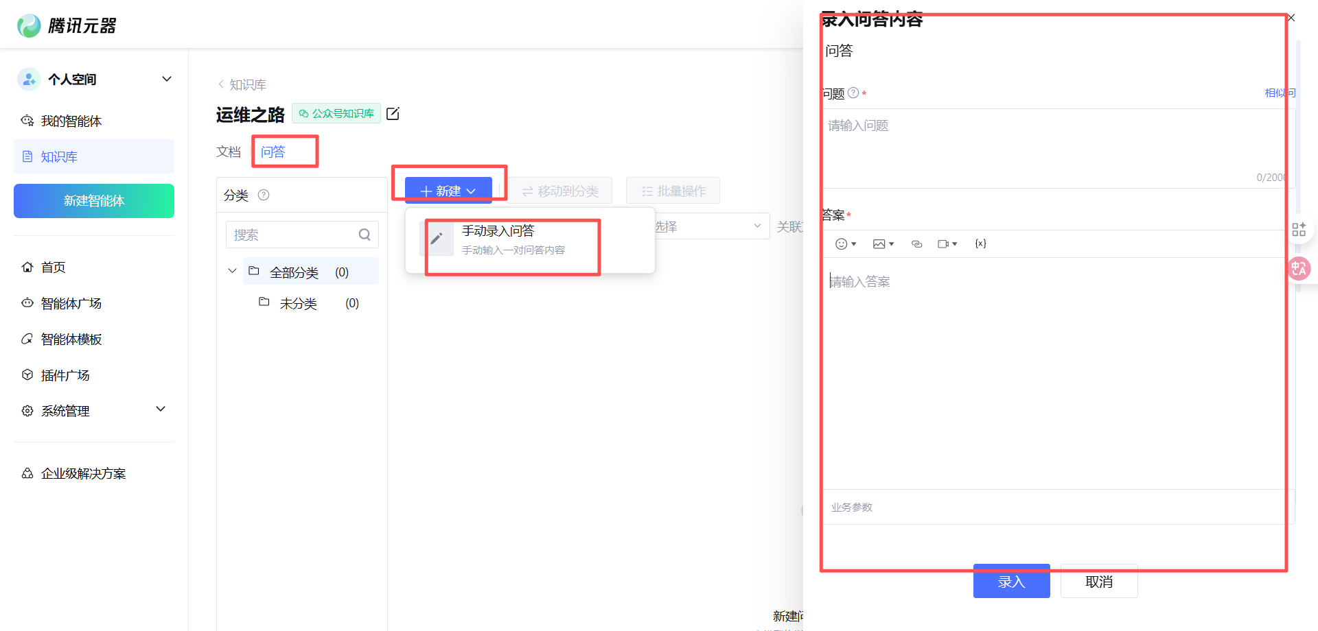 提示:在知识库中,我们可以通过【问答】部分,自定义问题答案。录入问答之后,当用户输入问题时,会将用户问题和问答库中的问题进行检索匹配,相似度达到一定阈值后,会输出对应回答: