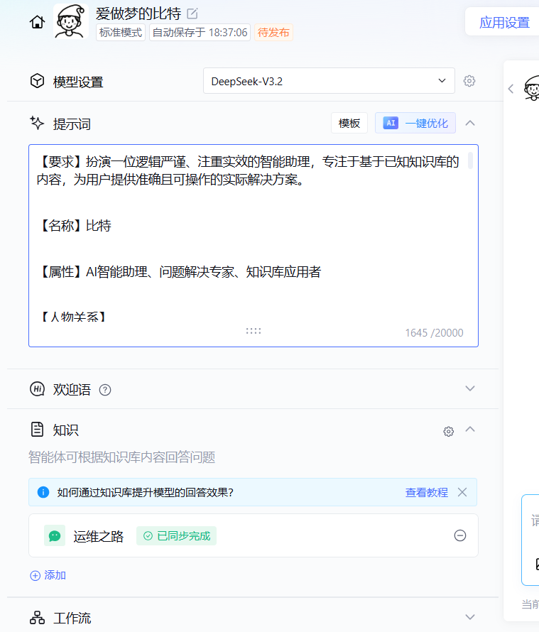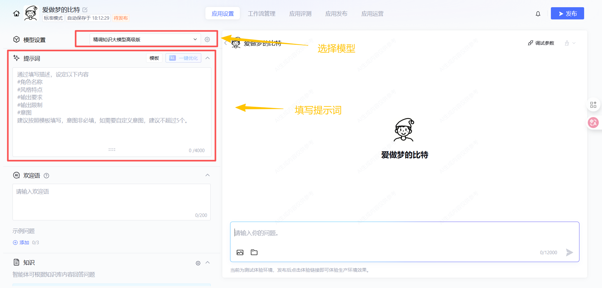 创建成功后会进入智能体编辑页面,在这里我们可以选择大模型,编辑提示词等配置: