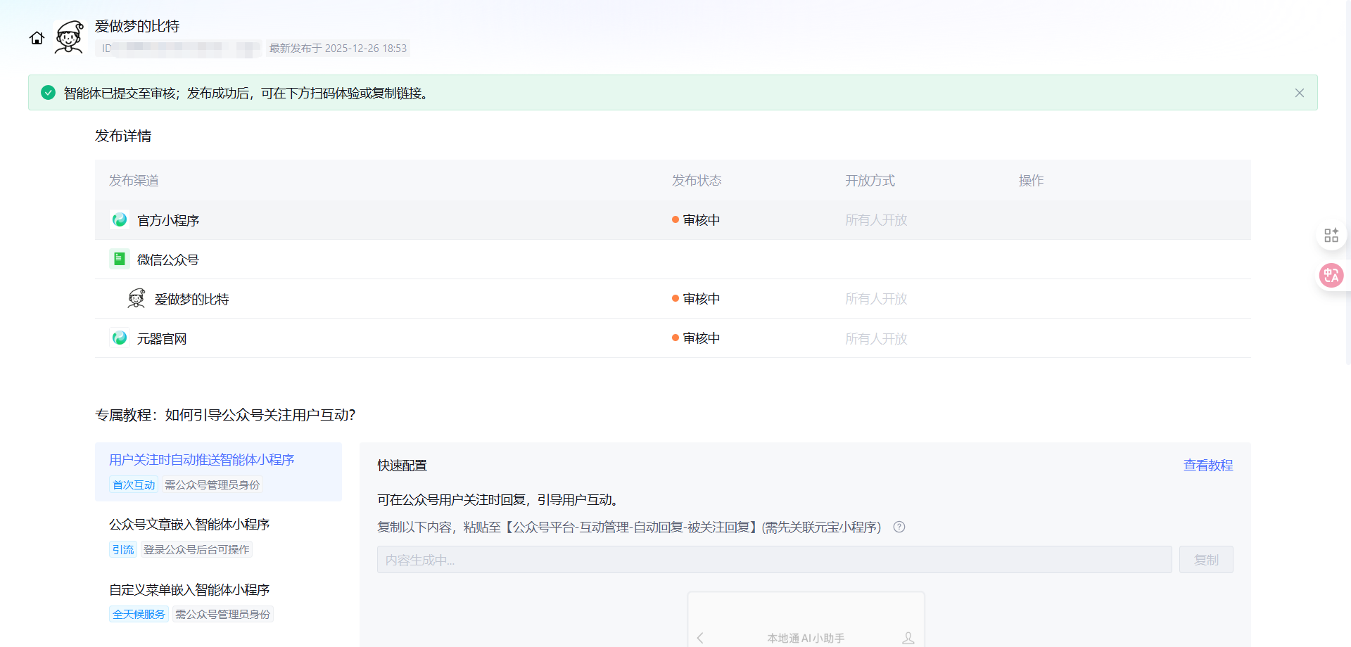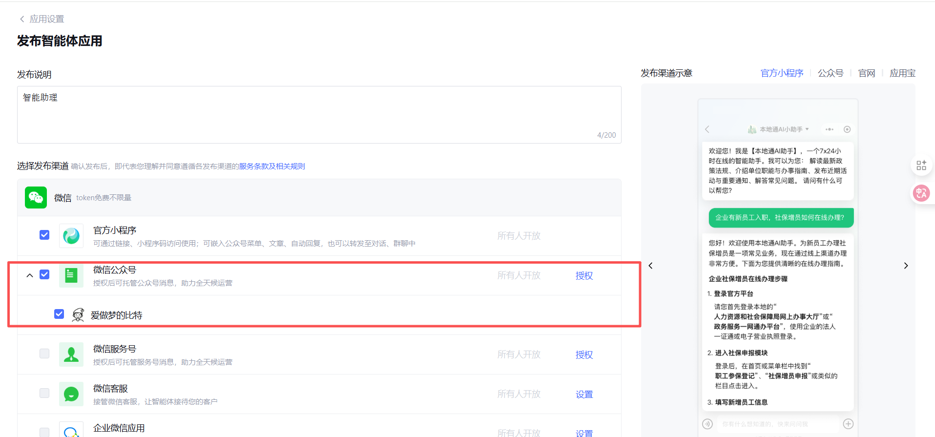 调整配置达到使用要求后,我们就可以点击发布智能体了,因为我们需要在公众号自动回复中使用,所以发布的时候要记得勾选自己的公众号: