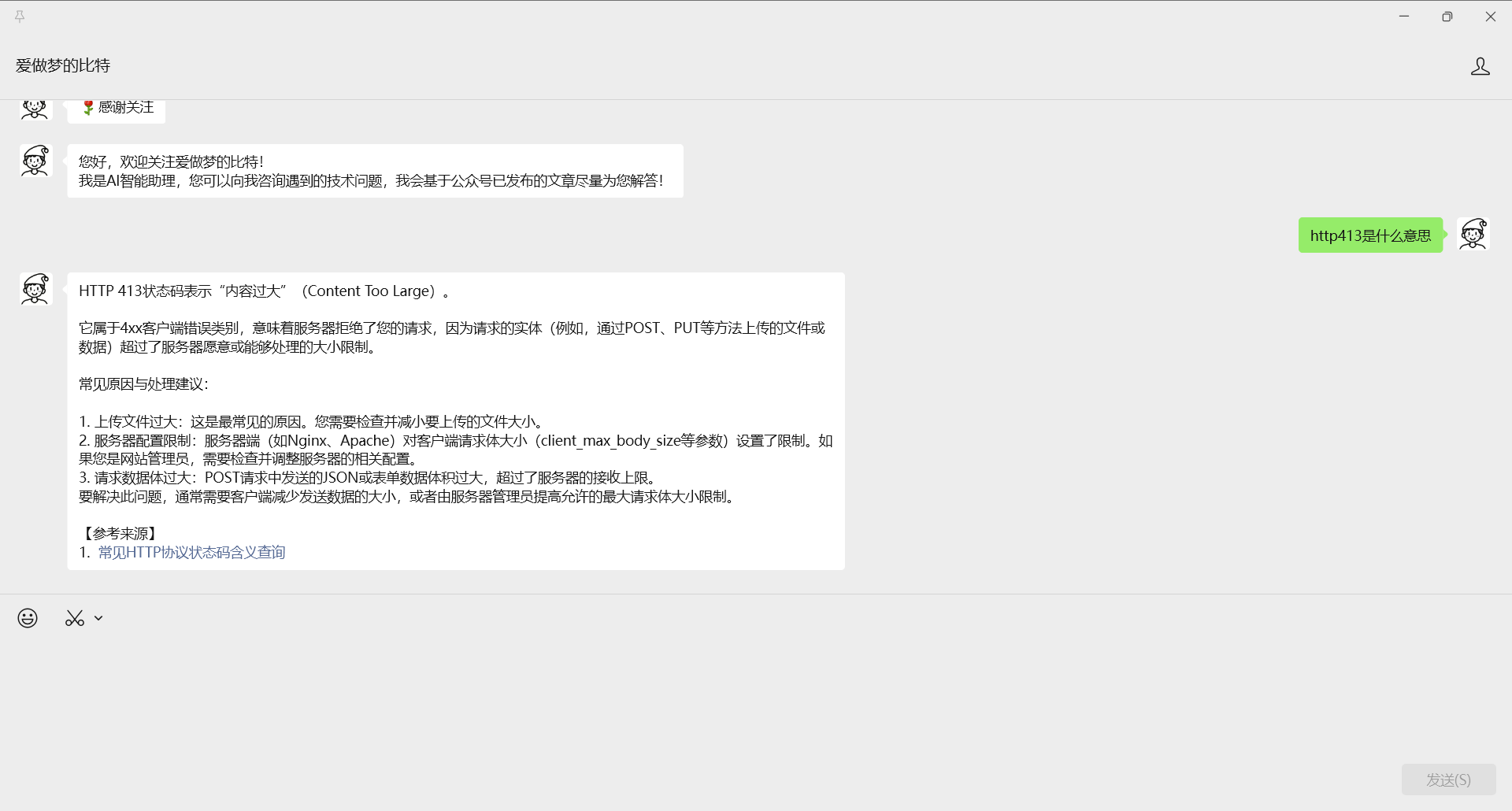 2.公众号私信回复不支持流式传输,所以每次回答都会有几秒延迟。
