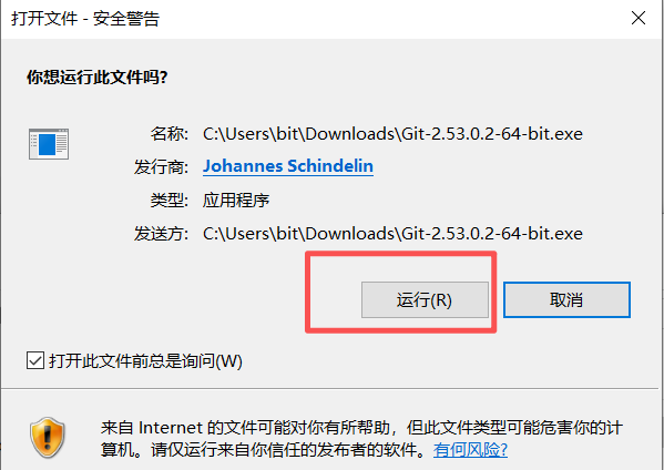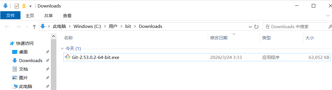 这里自动下载的最新版本Git-2.53.0.2-64-bit.exe,浏览器默认会到下载到用户目录下的Downloads文件夹: