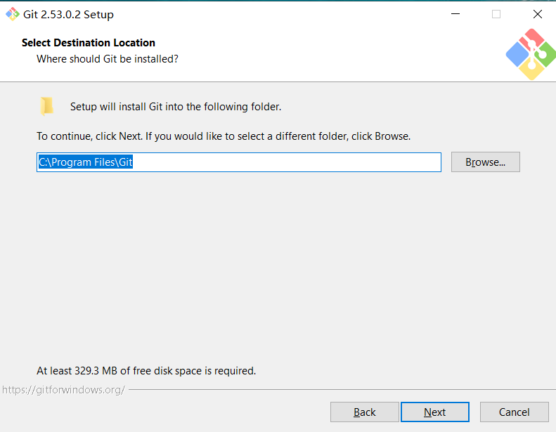 选择安装路径,默认目录C:\Program Files\Git,如果需要更换其他目录,需要确保目录中不包含中文字符:
