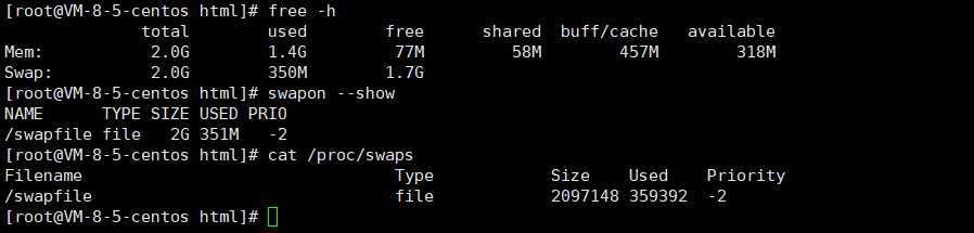 swap一般建议大小和物理内存相等,我们服务器内存是2G,所以使用下面命令在根目录下创建一个2G的缓存文件: