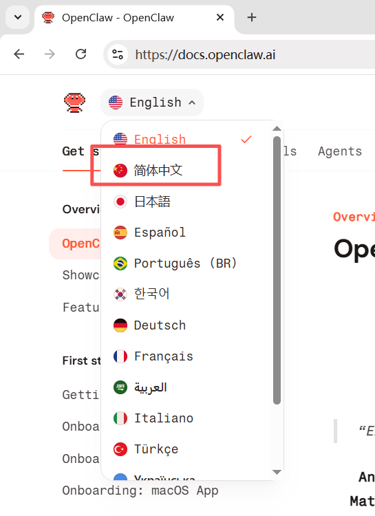 官方文档有时候直接进入中文版页面会被无限308重定向导致不能进入,我们可以直接访问:https://docs.openclaw.ai/