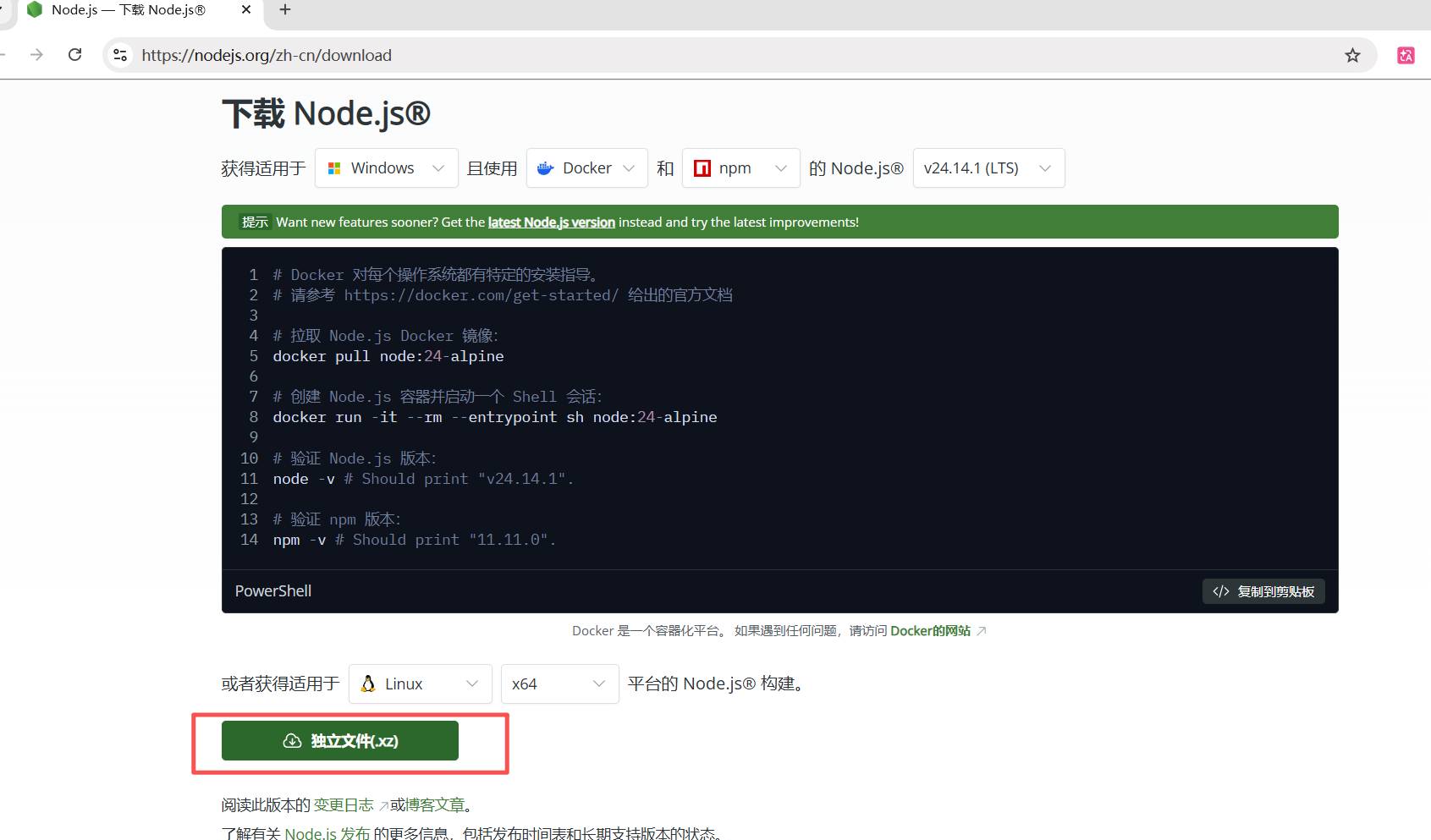 系统迁移升级完成后通过访问node.js官网下载Linux二进制安装包上传到服务器: