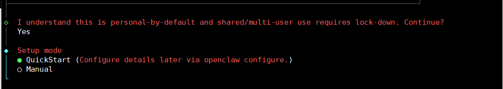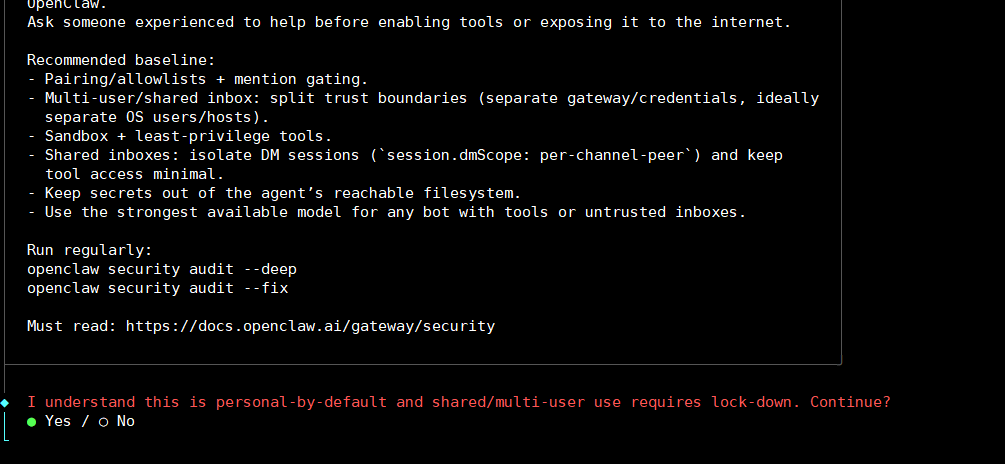 openclaw onboard --install-daemon 运行后进入交互界面,首屏有安全警告,选择Yes后按回车继续: