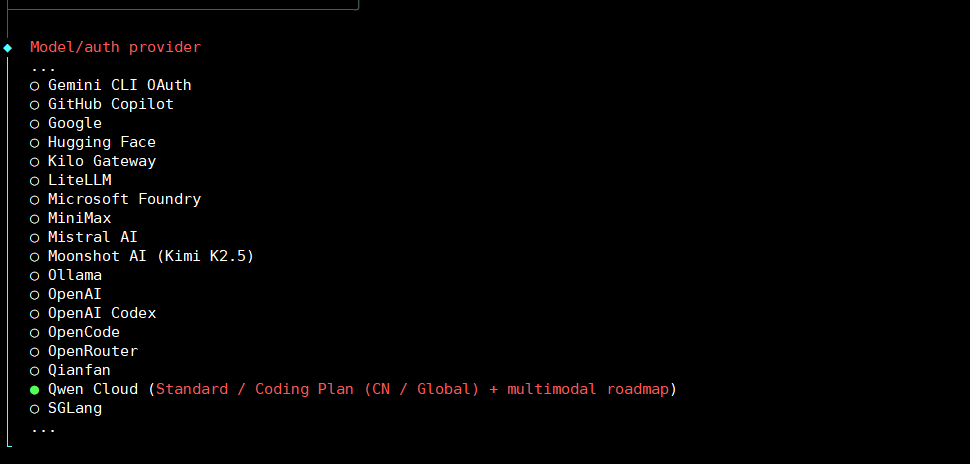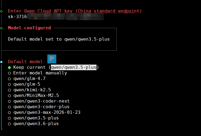 输入完API key后,OpenClaw会自动去联网验证,验证成功后会列出可选模型列表,这里我们选择默认的qwen/qwen3.5-plust模型: