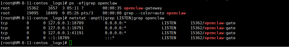 这时候OpenClaw网关也已经启动了,可以查看系统进程和端口监听: