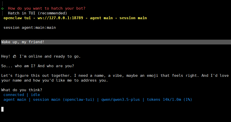 注:后续可以通过openclaw tui命令再次打开文本对话框。