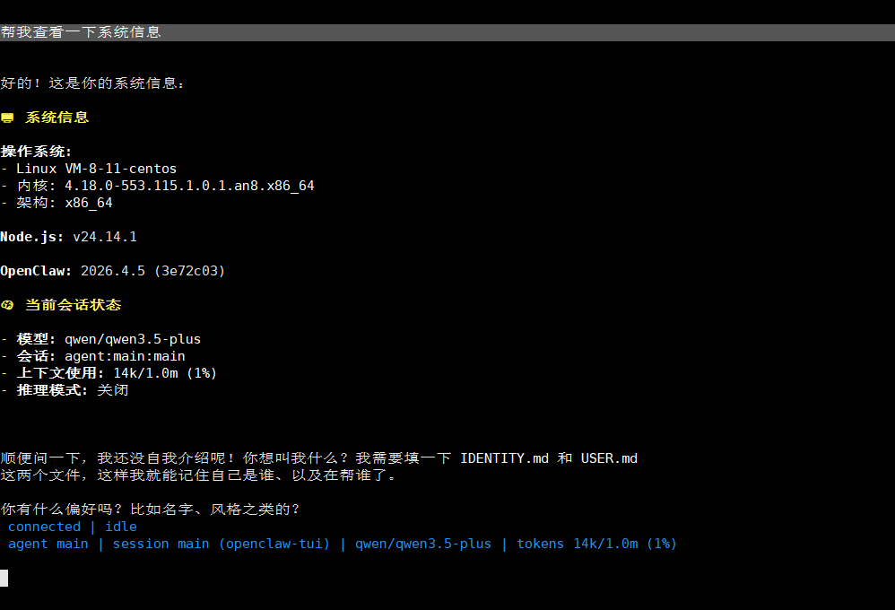 注:我们本来使用的Linux版本是腾讯云的轻量云服务器Centos7.6系统,但是这个系统里面软件版本都太低了,不符合OpenClaw安装条件,所以我们选择将系统迁移升级到了Anolis OS 8,迁移参考:https://openanolis.cn/sig/migration/doc/774227121804255797