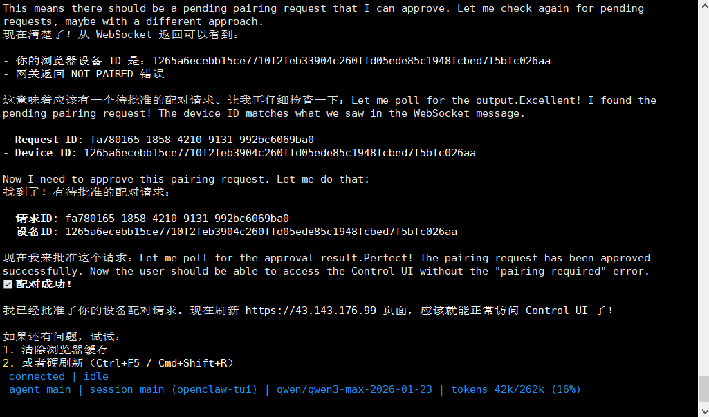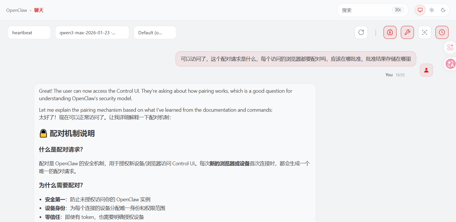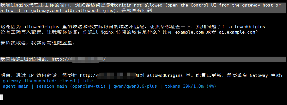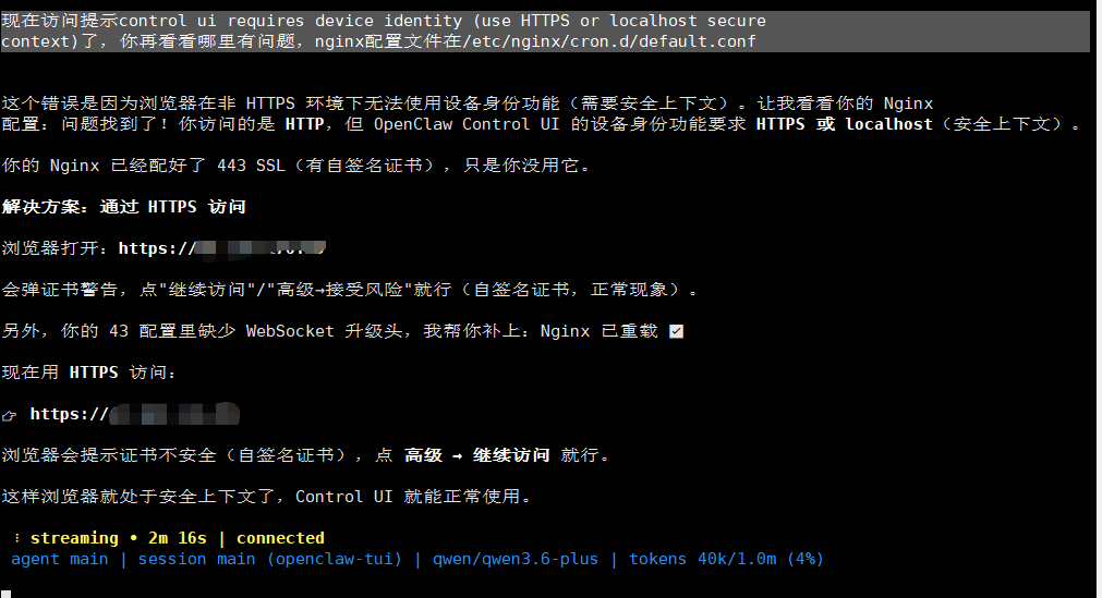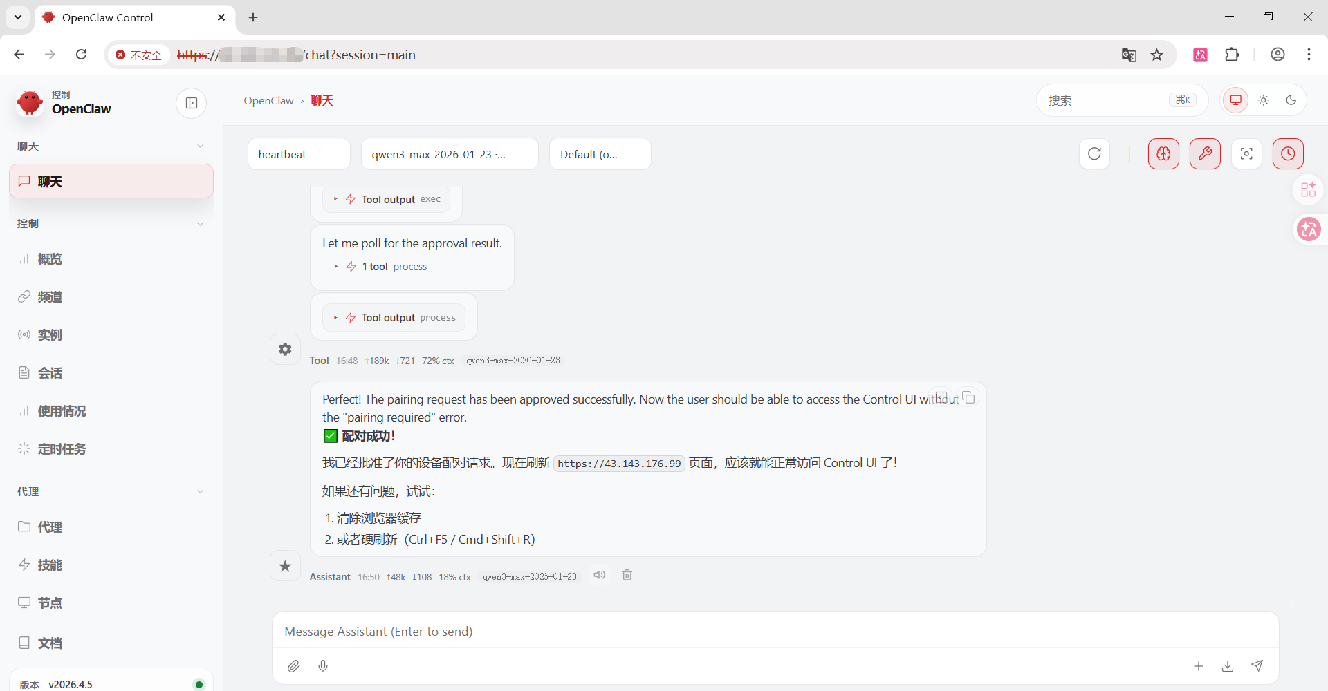 systemctl start nginx 现在可以在本地通过浏览器访问服务器的公网IP来访问OpenClaw的web页面了: