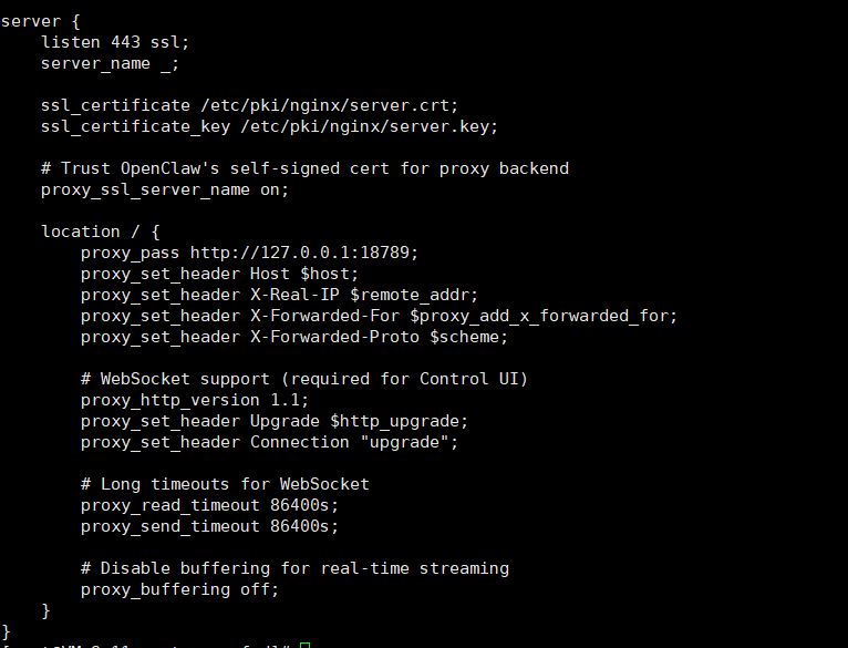 vi /etc/nginx/conf.d/default.conf 在配置文件中增加OpenClaw代理配置: