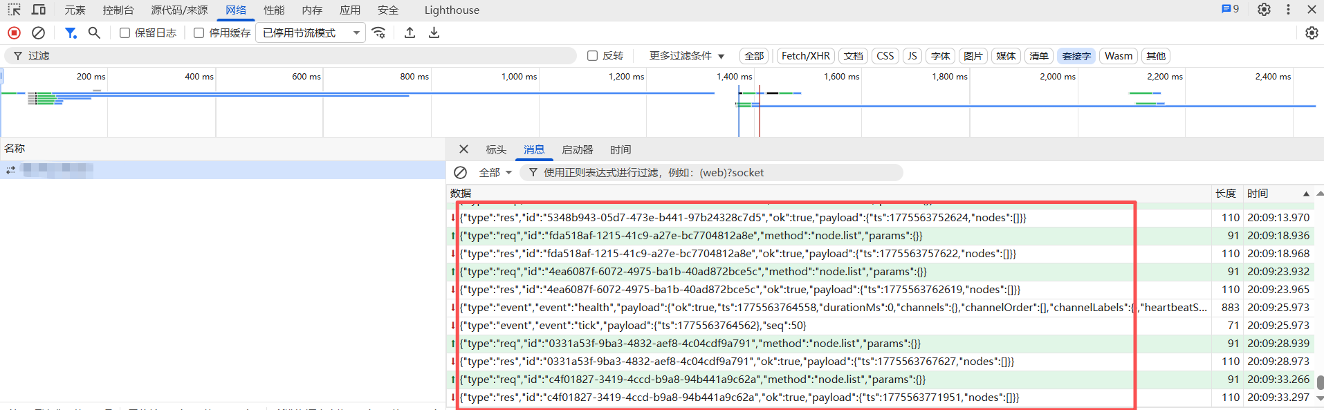 OpenClaw是通过websocket与后台通信的,我们可以按F12键打开浏览器调试,在套接字中查询到错误代码: