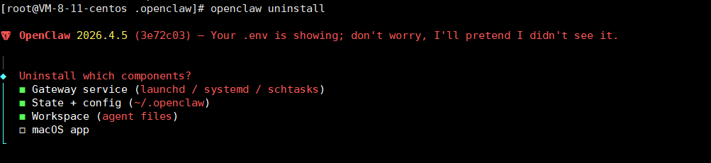openclaw uninstall 选择需要卸载的服务(空格键选择,选项前面格子变成绿色+号为选中,一般默认会全部选中):