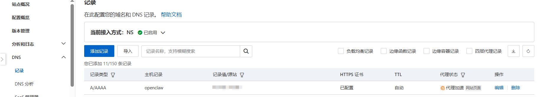 } 域名解析配置,我们使用的是阿里云的ESA,直接在DNS记录中添加解析: