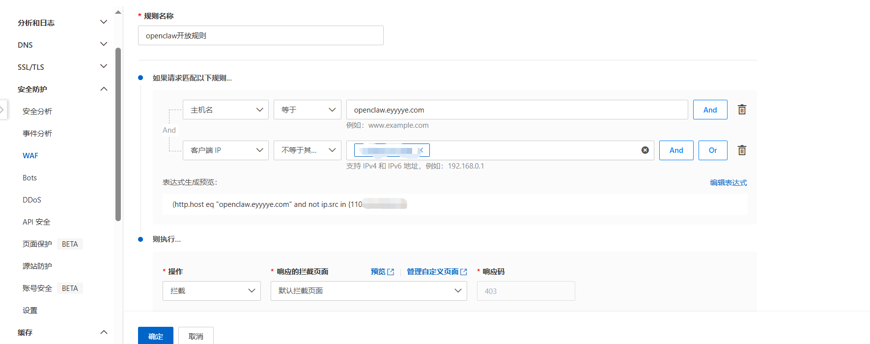 出于安全考虑,加个WAF防火墙白名单,只允许指定ip访问: